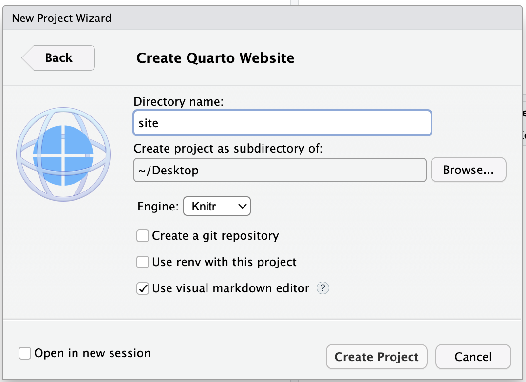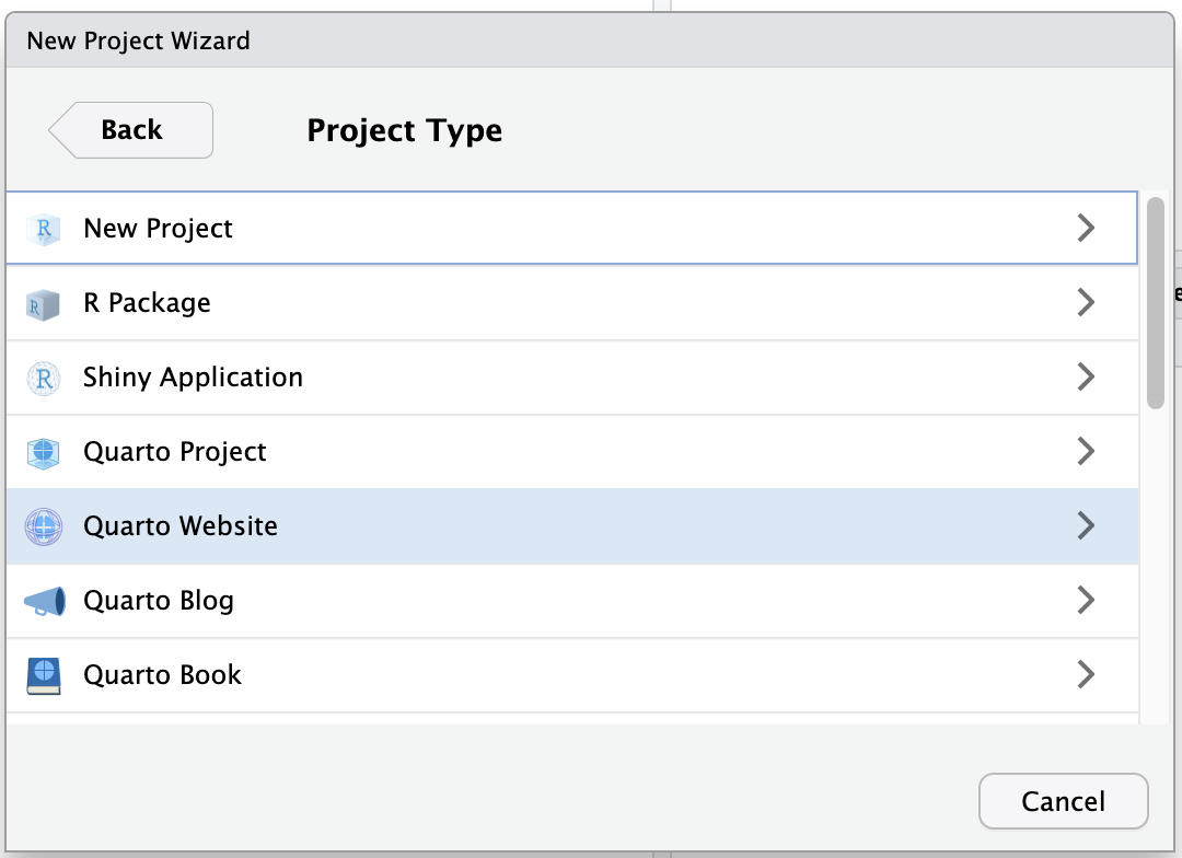 - Selecione “New Project…” → “New Directory” → “Quarto Website